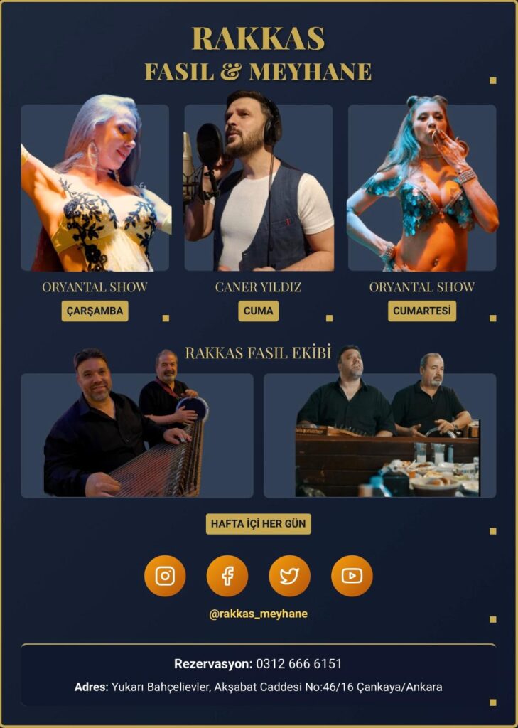 2014 yılında Ankara’nın kalbinde kurulan Rakkas Meyhane, geleneksel meyhane kültürünü yaşatırken, modern dokunuşlarla misafirlerine unutulmaz bir deneyim sunuyor. Başkent’in samimi ve sıcak atmosferini mekanımıza taşıyarak, dostlukların pekiştiği, eğlencenin ve müziğin bir araya geldiği bir buluşma noktası yarattık.